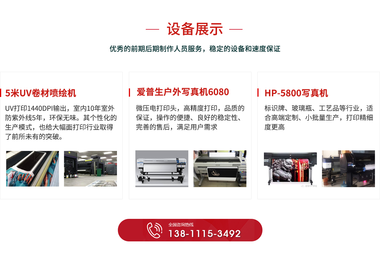 多臺(tái)5M3.2MUV打印設(shè)備,多臺(tái)愛普生HP打印設(shè)備,進(jìn)口后道設(shè)備,全套多臺(tái)快速加工能力大廠房為批量加工奠定基礎(chǔ)能力的能力,快效的項(xiàng)目執(zhí)行能力、優(yōu)異的團(tuán)隊(duì)協(xié)作能力